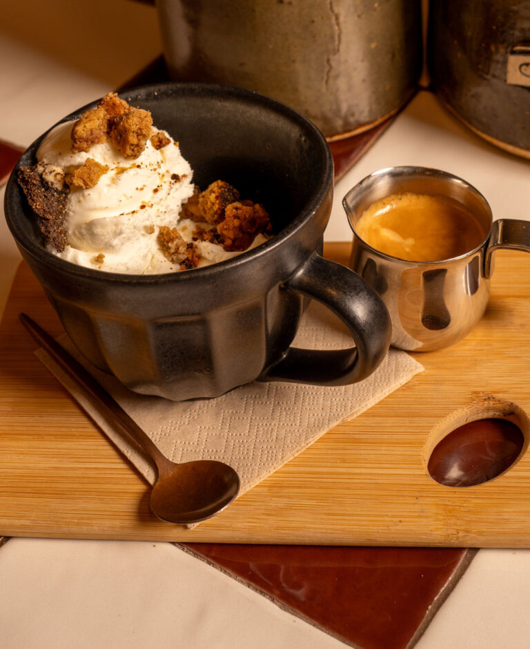 Fiore di latte ice cream served with our homemade cookie crumble and a shot of espresso.