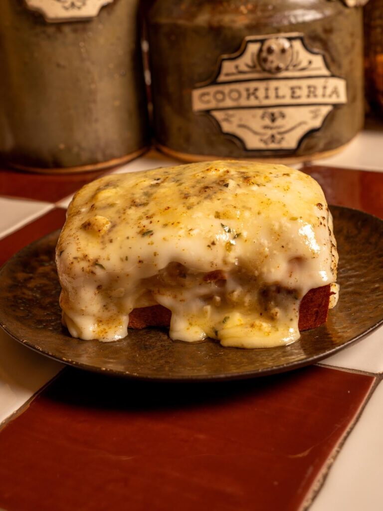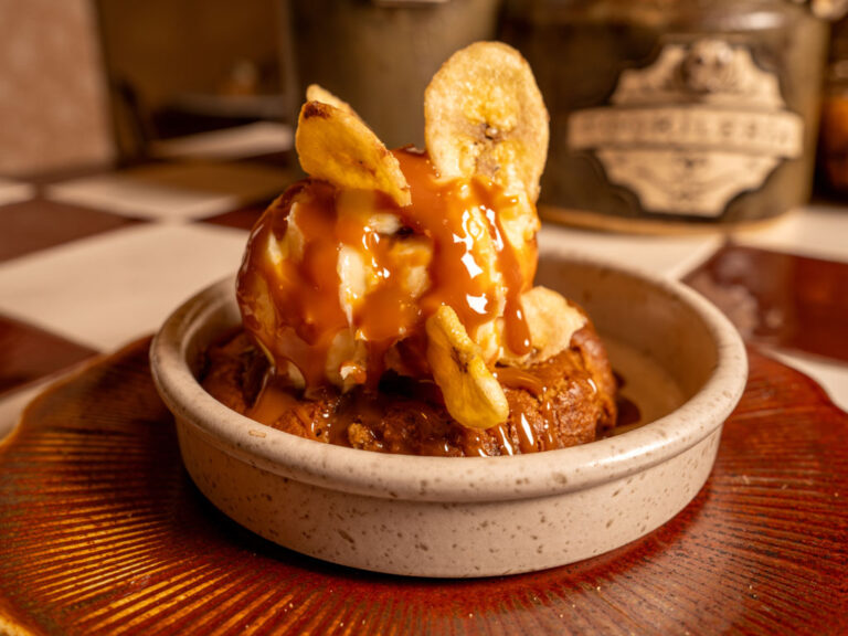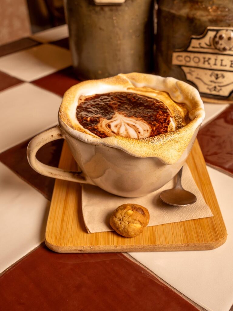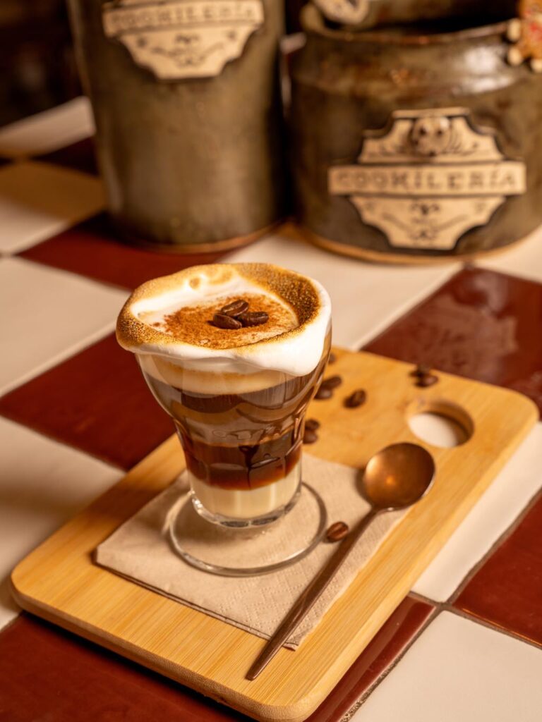 Condensed milk, our personalized mix of “asiático”( burned 43 liqueur, brandy, lemon, orange and cinnamon), espresso, creamed milk and burned meringue.
