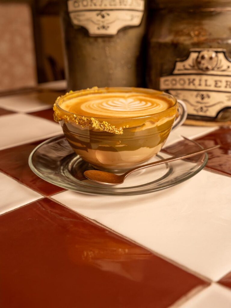 Cappuccino with homemade sweet pistachio cream and 100% natural pistachio