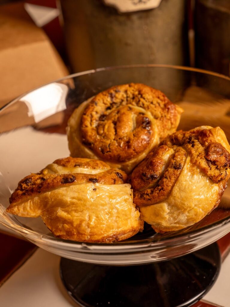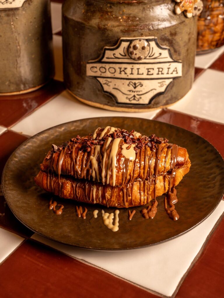 Toasted croissant served with hazelnuts chocolate sauce and cocoa nibs.