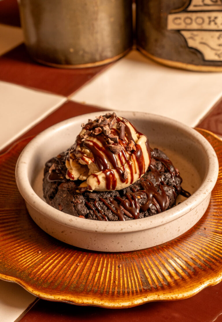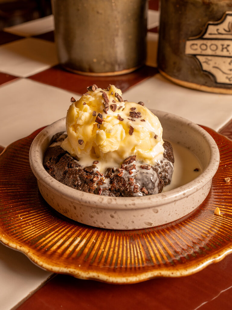 Cocoa, dark cocoa, dark chocolate and cocoa nibs. Served with vegan pistachio ice cream and dark chocolate sauce topping.