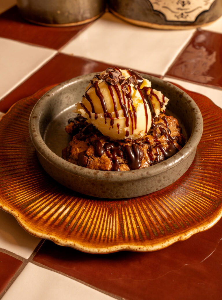 Classic dough with dark chocolate and walnuts. Served with pistachio vegan ice cream and dark chocolate sauce topping.