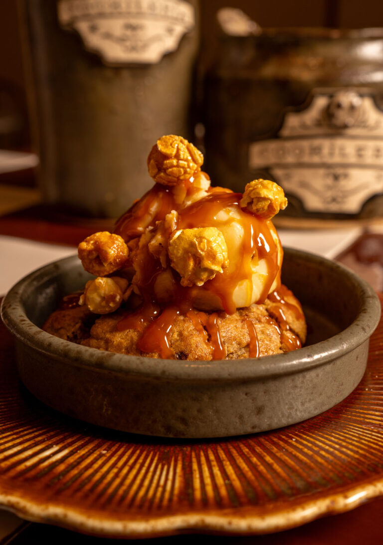 Popcorn and caramel cookie made with tortilla chip flour, topped with salted caramel and popcorn.