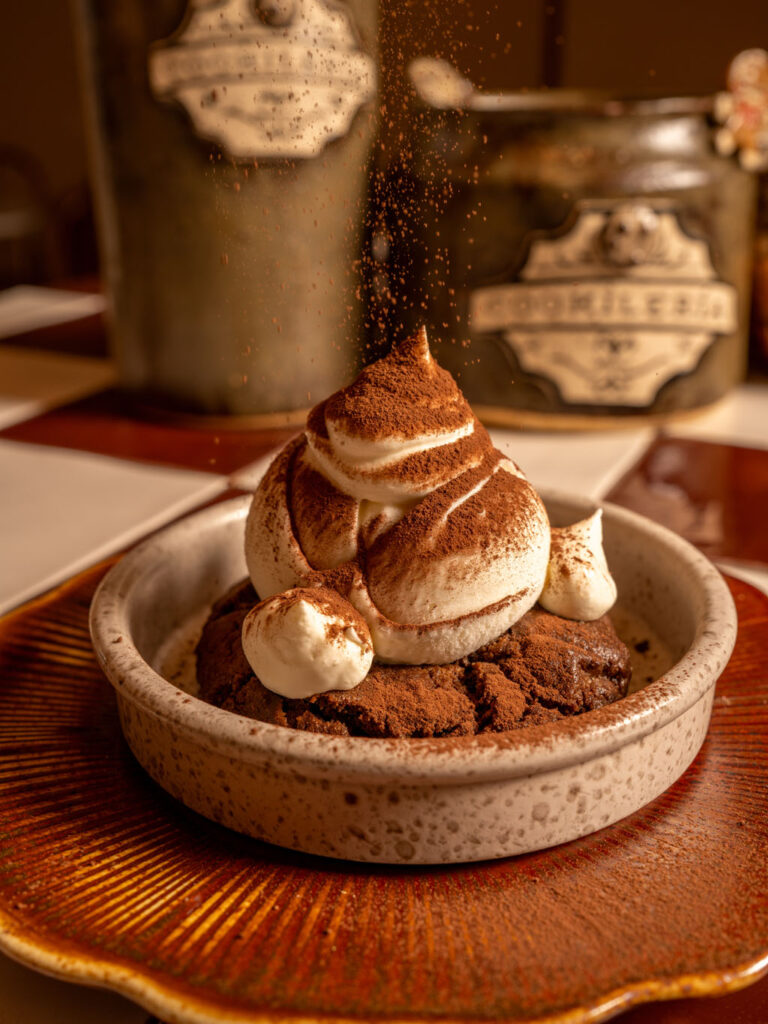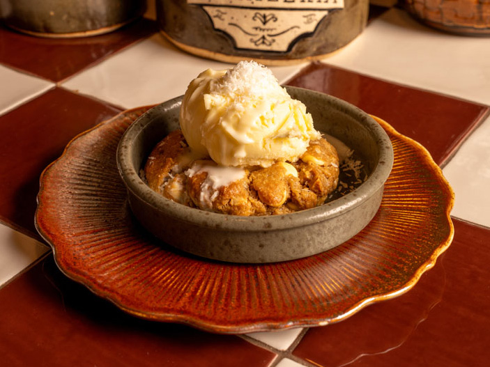 Cocoa cookie made with browned butter and hint of decaf coffee, topped with mascarpone cream and dusted with cocoa poder. (Served with cream ice cream.)