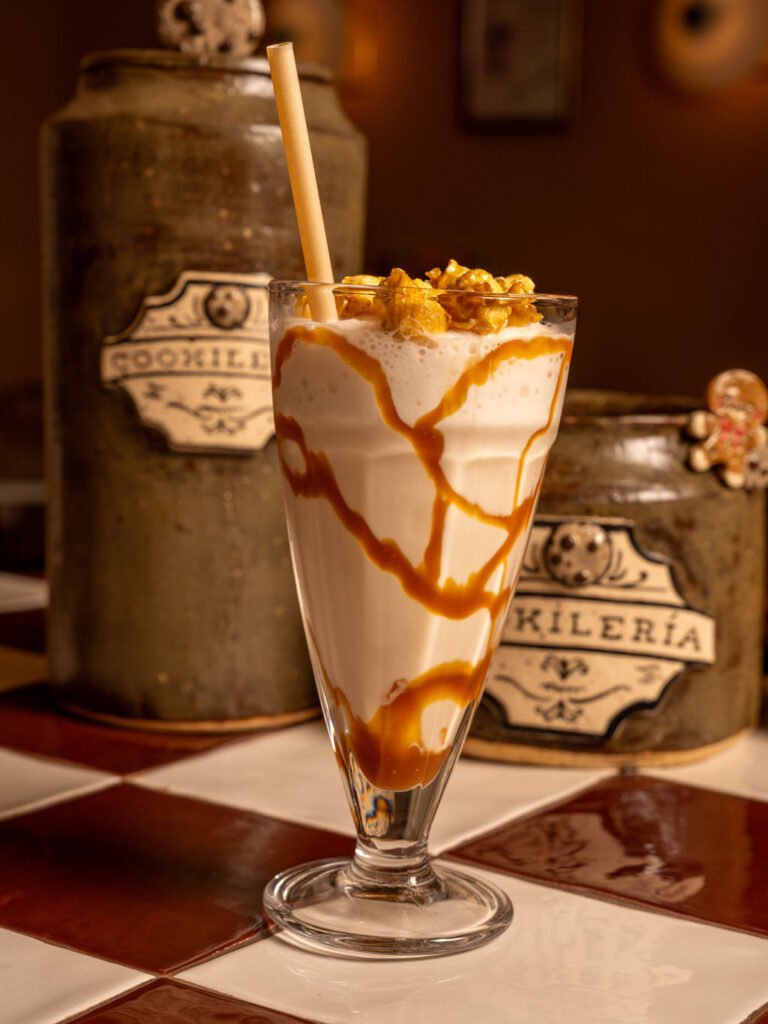 Vanilla frappe with popcorn syrup, salted caramel, ice and milk.
